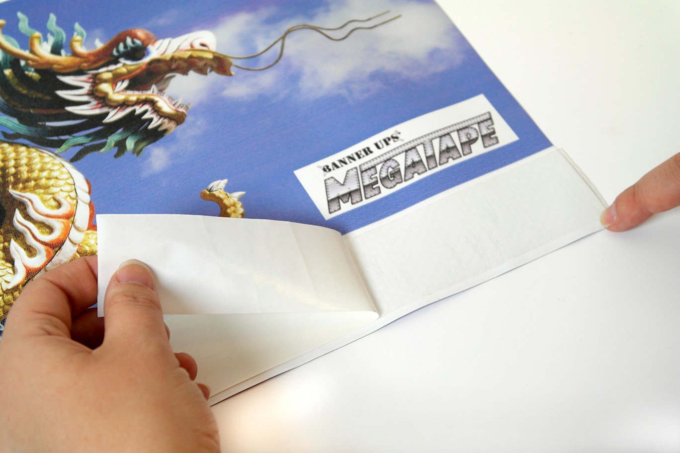 Banner Ups® MegaTape is a double-sided Banner Hem reinforcing tape that is made of a super strong film. Now with a new clear film, MegaTape banner hem tape is even stronger than our original product – 10% stronger in both lab tensile tests and wind tunnel test. Improved MegaTape banner hem tape withstood winds up to 108 MPH!! Use MegaTape when ultimate banner strength is required.